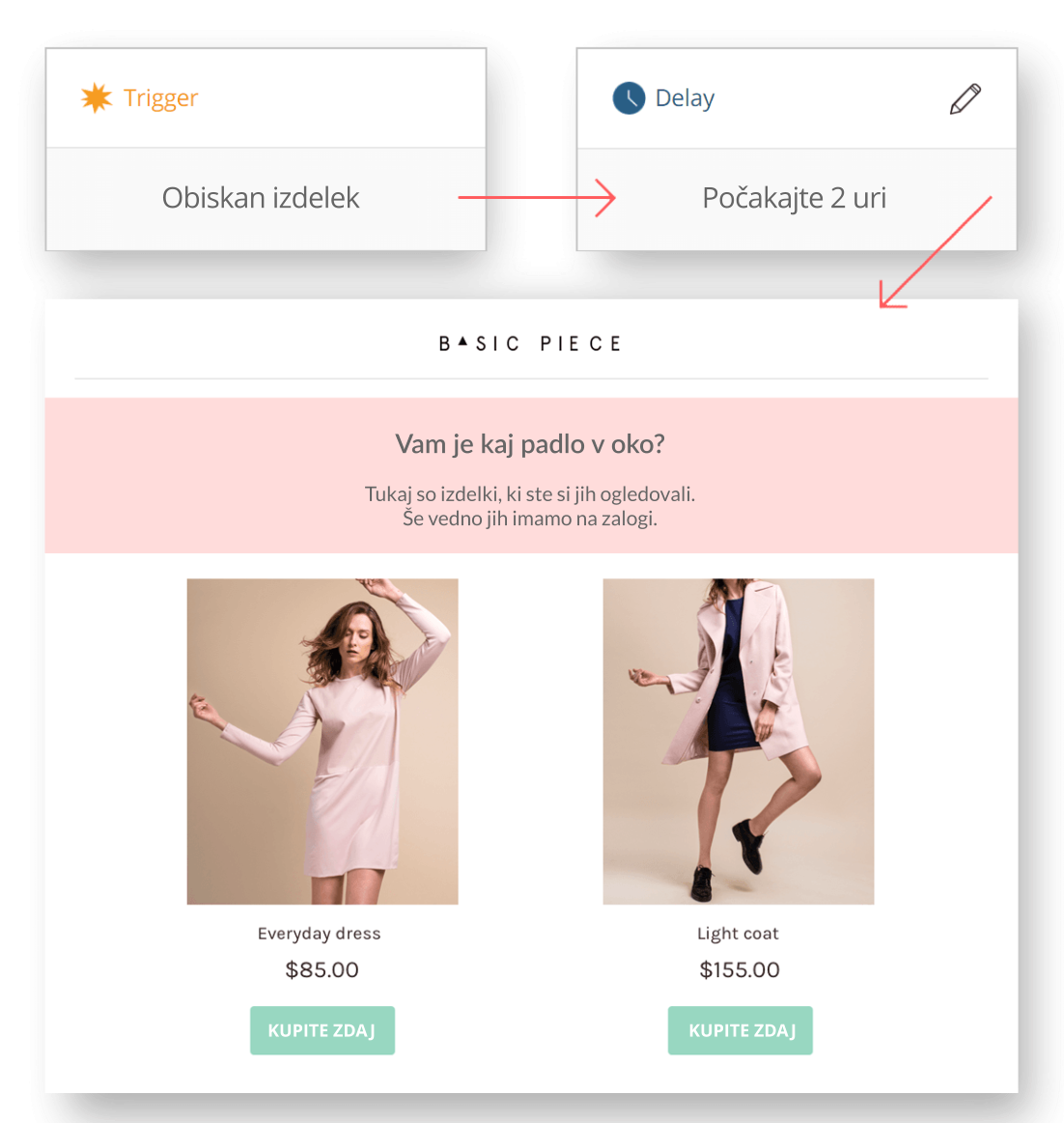 Ko enkrat veste, katere izdelke so si ogledali vaši kupci, zakaj jih ne bi spodbudili za oddajo naročila? Navsezadnje so že pokazali zanimanje za vaše izdelke in bodo verjetno izvedli nakup. Pomagajte svojim kupcem pri odločitvi z našimi avtomatiziranimi e-poštnimi sporočili o opustitvi izbranih izdelkov. Pošljite personalizirana priporočila podobnih izdelkov na podlagi izdelkov, ki so jih dejansko videli, vendar jih še niso dodali v voziček.