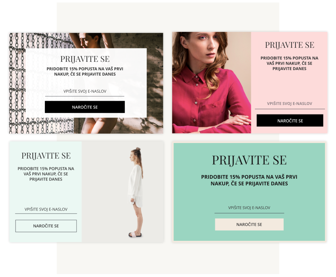Omnisend ponuja obilo predpripravljenih pojavnih oken, s čudovitimi slikami, vpadljivimi besedili in različnimi stili. Vendar pa jih lahko poljubno prilagodite na način, ki bo pritegnil pozornost obiskovalcev že prvi trenutek. Vaša pojavna okna so lahko duhovita, resna ali celo vsebujejo super popust, ki bo obiskovalce prepričal v prijavo.
